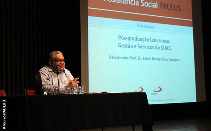 Com um discurso rico, o Prof. Dr. fez uma análise histórica de diversos paradigmas de ação – como caridade e assistencialismo – que precederam o atual momento de atuação da Assistência Social no país.