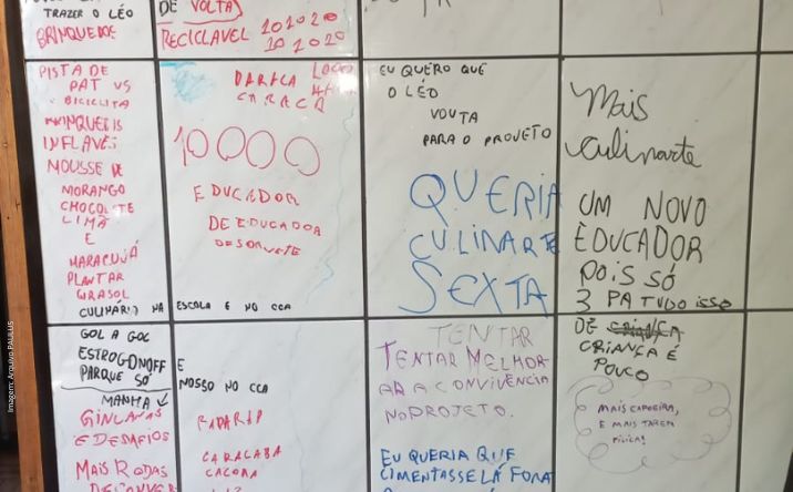 As últimas duas semanas de março foram dedicadas ao processo de avaliação de satisfação no Centro PAULUS de Convivência – Osasco. Aproveitamos o ensejo de uma brincadeira feita por uma das crianças, que escreveu na parede sugestões para o cardápio dos próximos meses, e pedimos para que outras crianças e adolescentes sugerissem algo no qual gostariam que tivéssemos no cotidiano das atividades. Somos então surpreendidos com tanta criatividade e as paredes de ouvidos atentos escutavam sonhos e pertencimento: