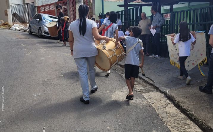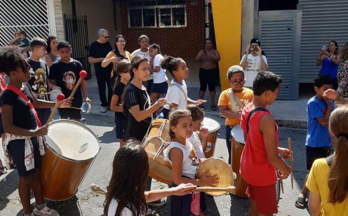 Depois de mais um dia de ensaio, as famílias foram convidadas para prestigiar as crianças e adolescentes e participar desse momento. Com instrumentos em mãos, descemos a rua embalados pelo som e cantorias das crianças, adolescentes e adultos, e subimos no ritmo dos instrumentos tocados pelos pais, mães e avós, que também tiraram muitas fotos.