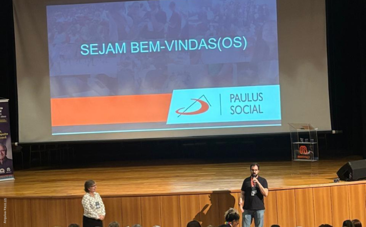 A assistente social e formadora pela PAULUS Social, Inmaculada Figols, convidou o coordenador dos atendimentos da PAULUS, Pedro Figueiredo, para falar da atuação no município. Pedro falou do importante trabalho feito pelo assessoramento e pela chegada da Gráfica, em 2019, e que, em 2024, foi inaugurado o Centro PAULUS de Convivência – Cotia, para atendimentos a crianças, adolescentes e pessoas idosas, reafirmando a importância da atuação em Cotia.