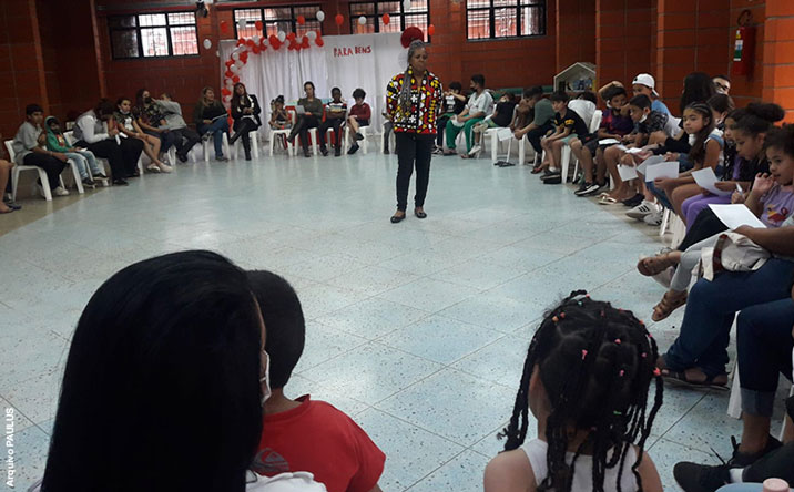 Após tal dinâmica, a professora Regine leu o poema “Vozes-Mulheres”, de Conceição Evaristo, e traçou vários paralelos com o cotidiano que cerca a vida de pessoas negras nas periferias. A professora demonstrou muita experiência no assunto e uma didática dialética, respondendo e provocando todes que estavam na roda a refletirem. Trouxe muitas experiências pessoais e pesquisas sérias realizadas no ambiente acadêmico. Ficou claro que muito já foi feito, mas, que há muito a se fazer para que a equidade de oportunidades seja realidade em nosso país.