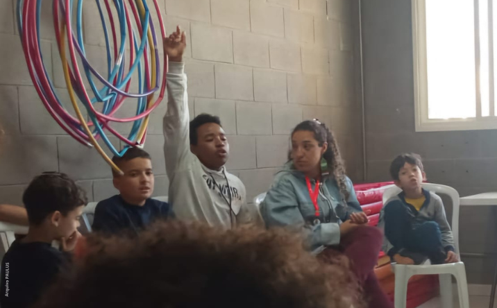 No Centro PAULUS – Freguesia do Ó não é diferente – os educadores habitualmente realizam rodas de conversa com as turmas. No entanto, há alguns meses, a equipe da unidade, percebendo assuntos comuns a todas as turmas, bem como os ruídos quando a conversa se dava separadamente em cada uma delas, propôs uma roda de conversa semanal com todas as turmas juntas, e essa prática tem acontecido e está se consolidando.
