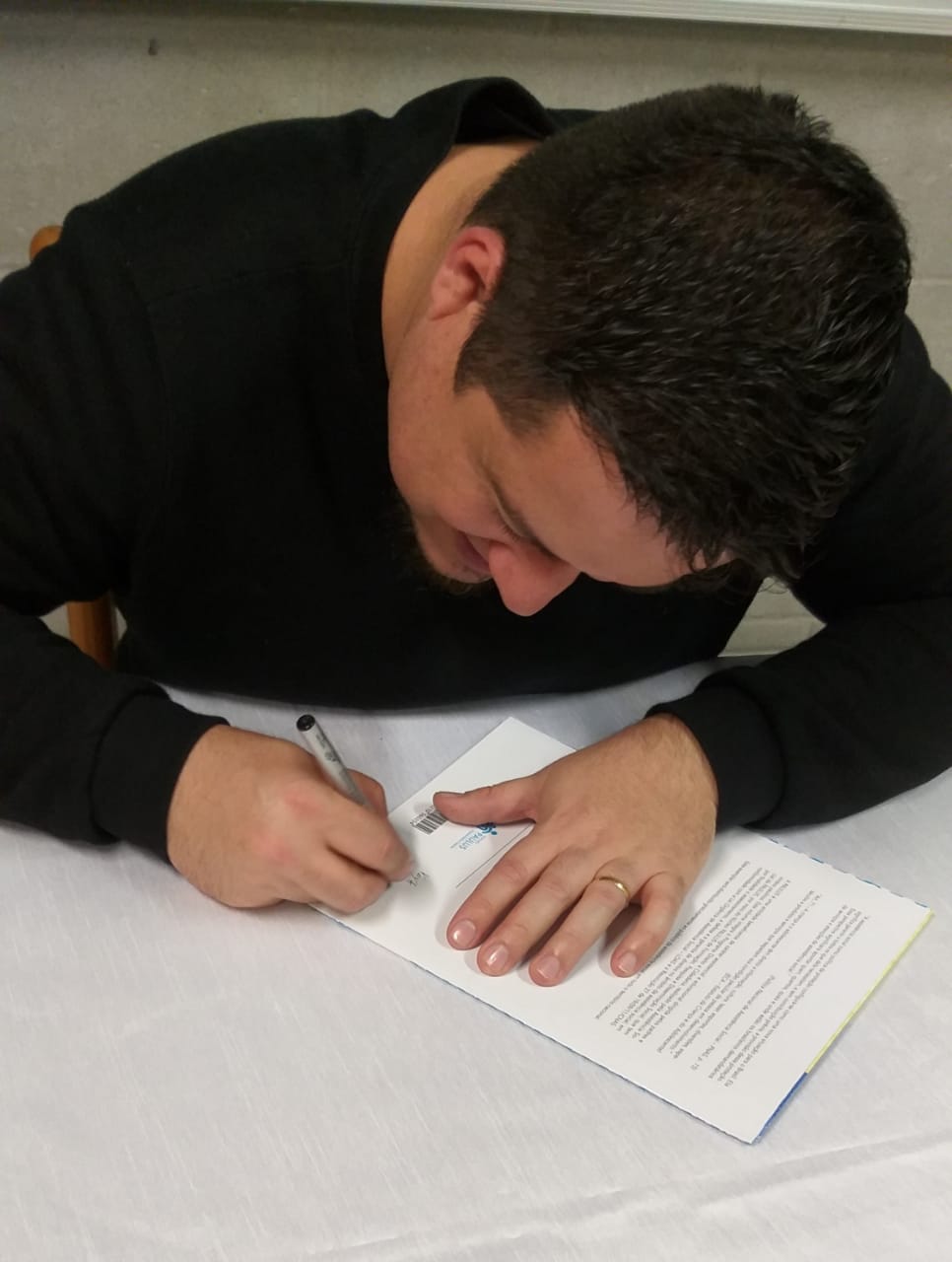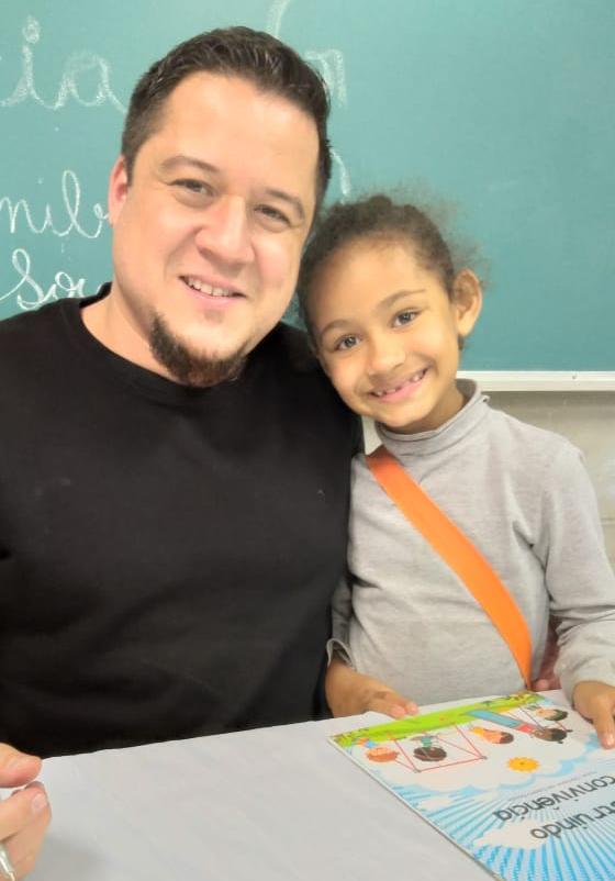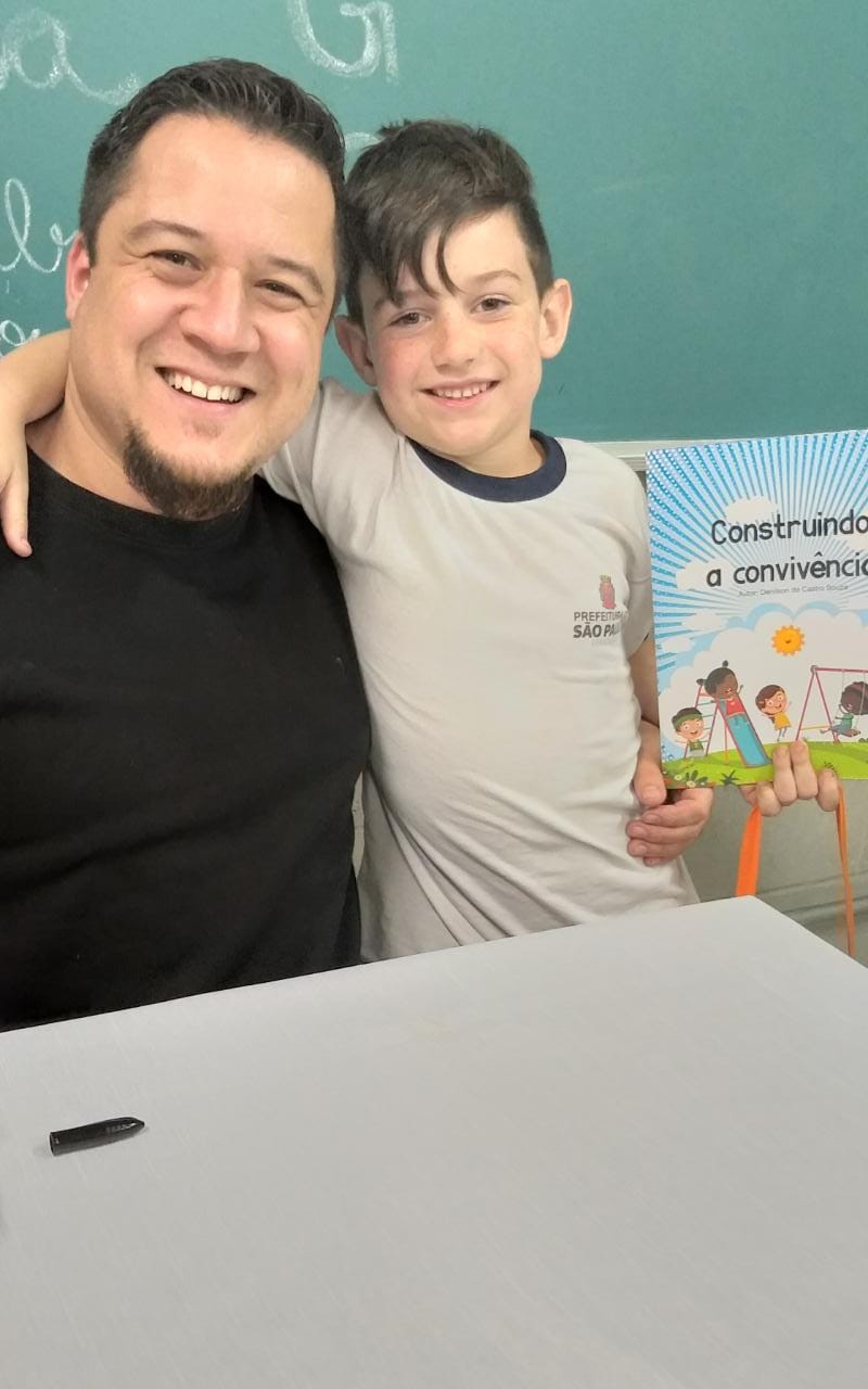 Para celebrar o momento, convidaram Denilson de Castro Souza, autor do jogo “Construindo a Convivência”, componente do kit PDEC 2019. Com brilho nos olhos e muito carinho, Denilson distribuiu autógrafos, abraços e sorrisos.