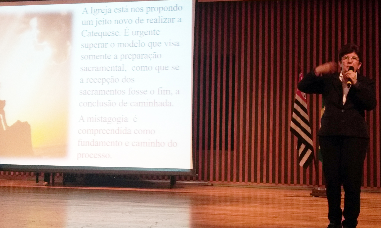 Ir. Teresinha falou sobre a importância de uma catequese familiar, próxima e inserida em todos os ambientes em que o catequizando vive e destacou também a necessidade do envolvimento dos pais neste processo catequético, além de falar sobre a mistagogia como pedagogia da fé: caminho de vida cristã. Para ela, o objetivo da abordagem do tema é despertar uma reflexão sobre a importância da mistagogia na vida do catequista e cristãos em geral. “A Mistagogia é fonte de sabedoria para todos os tempos. Ela perpassa a ação evangelizadora, conduz ao caminho progressivo do mistério e possibilita fazer a experiência da vida com Deus”, diz a irmã.