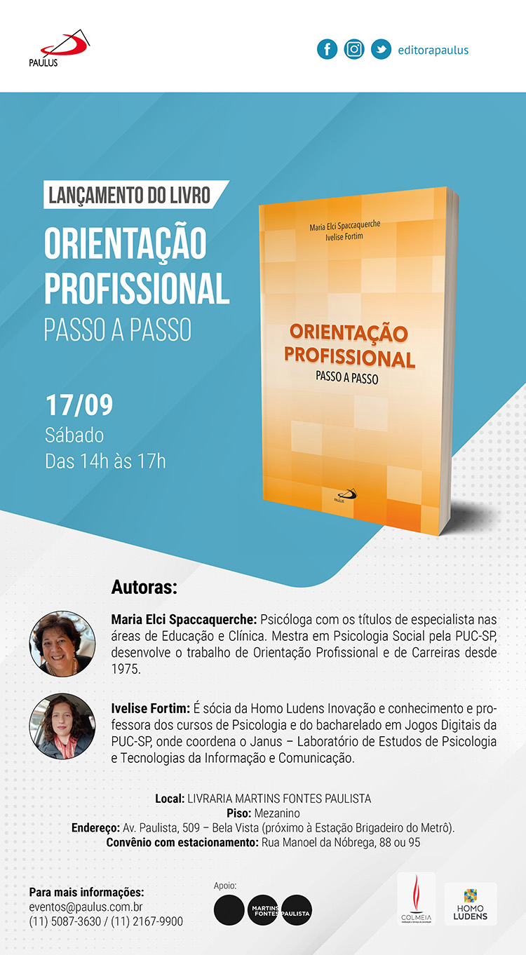 Em parceria com a Colmeia – Instituição a Serviço da Juventude, a Homo Ludens e a Livraria Martins Fontes, a PAULUS Editora convida para o lançamento presencial do livro “Orientação profissional passo a passo”. O evento acontecerá no sábado, dia 17 de setembro, das 14h às 17h, na Livraria Martins Fontes, localizada na Avenida Paulista, 509, em São Paulo (SP).