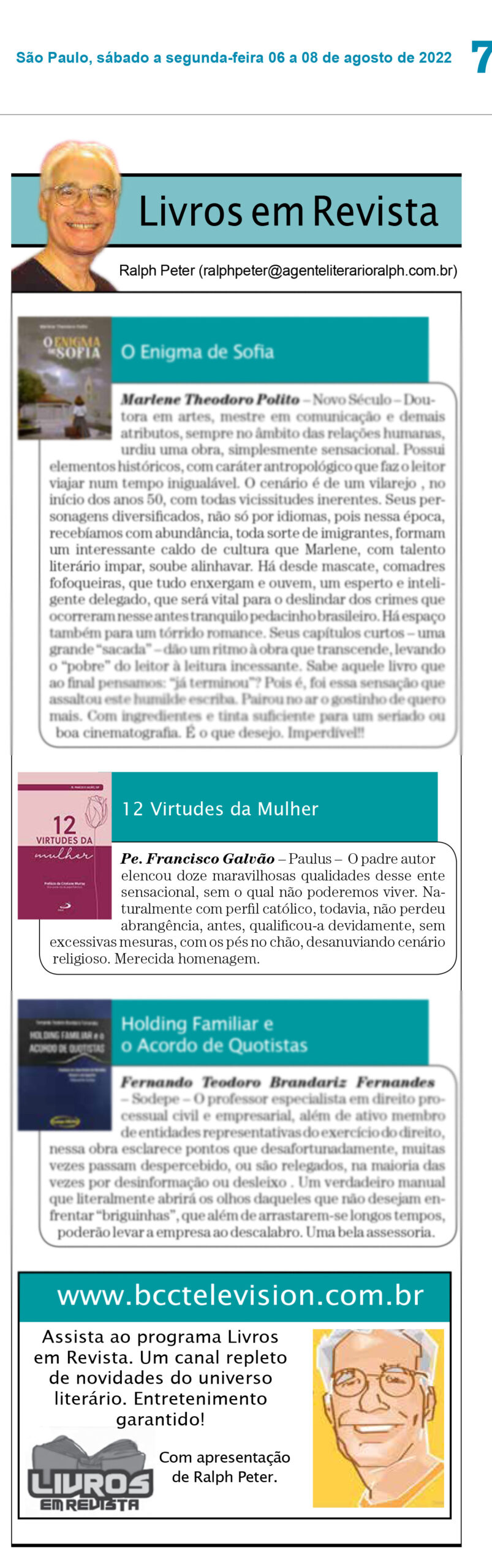 Descrição: O livro "12 virtudes da mulher", de Pe. Francisco Galvão, ssp, foi destaque na coluna "Livros em Revista", de Ralph Peter, do Jornal Empresas e Negócios.