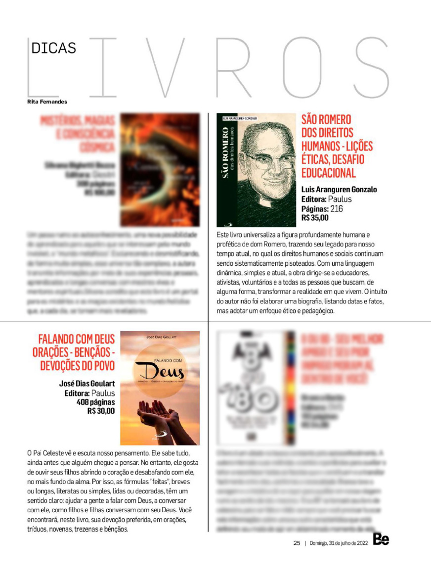Descrição: A Revista "Bem-estar", de São José do Rio Preto, indicou na coluna "Livros" as obras "São Romero dos direitos humanos" e "Falando com Deus".