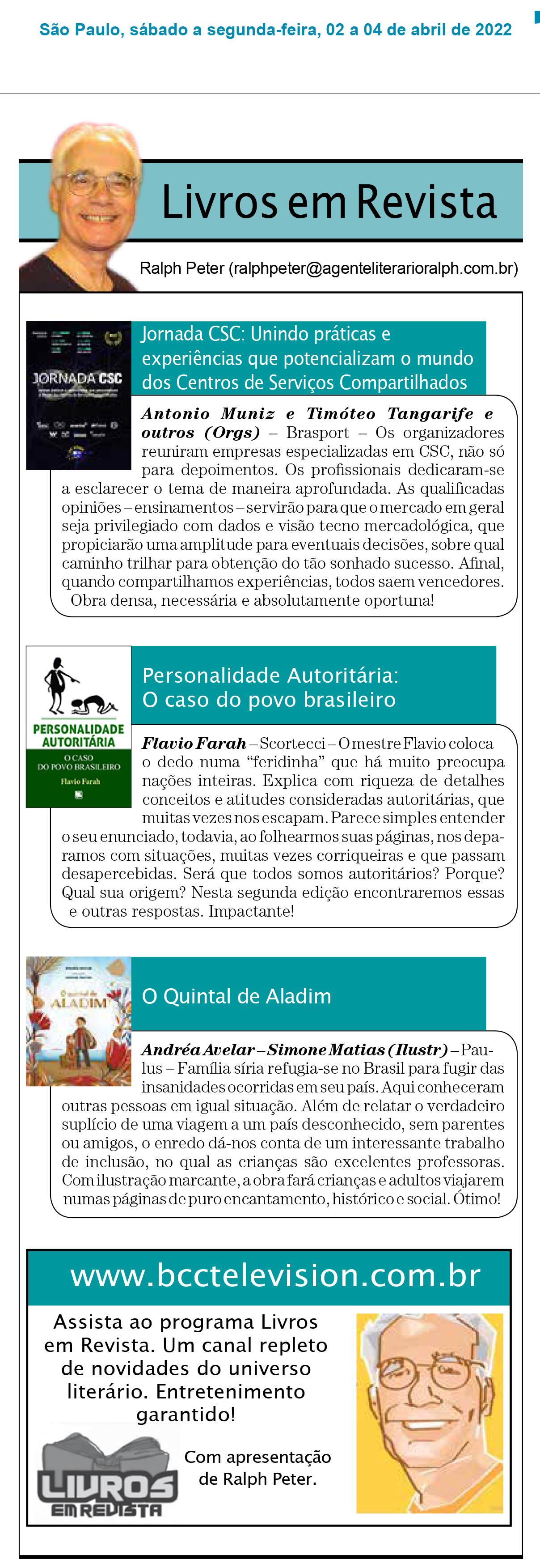 Descrição: O livro "O quintal de Aladim", de Andréa Avelar com ilustrações de Simone Matias, foi destaque na coluna "Livros em Revista", de Ralph Peter, do Jornal Empresas e Negócios.