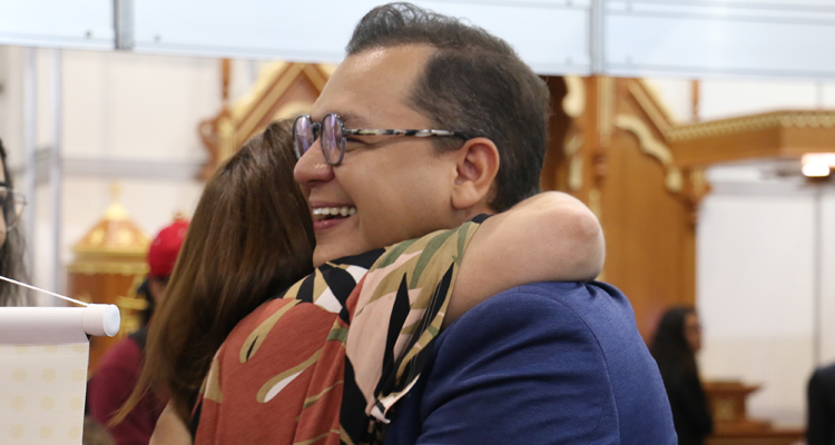 Pe. Denis-Ricard abraça leitora durante lançamento do livro “Molda-me”