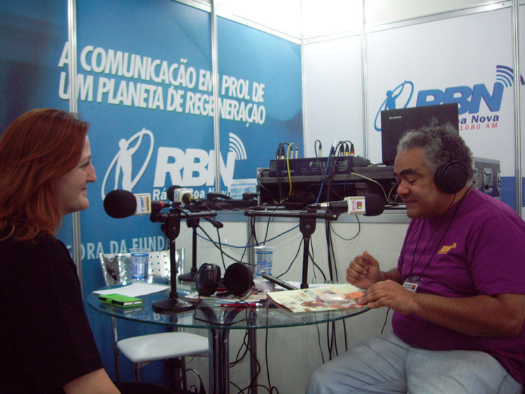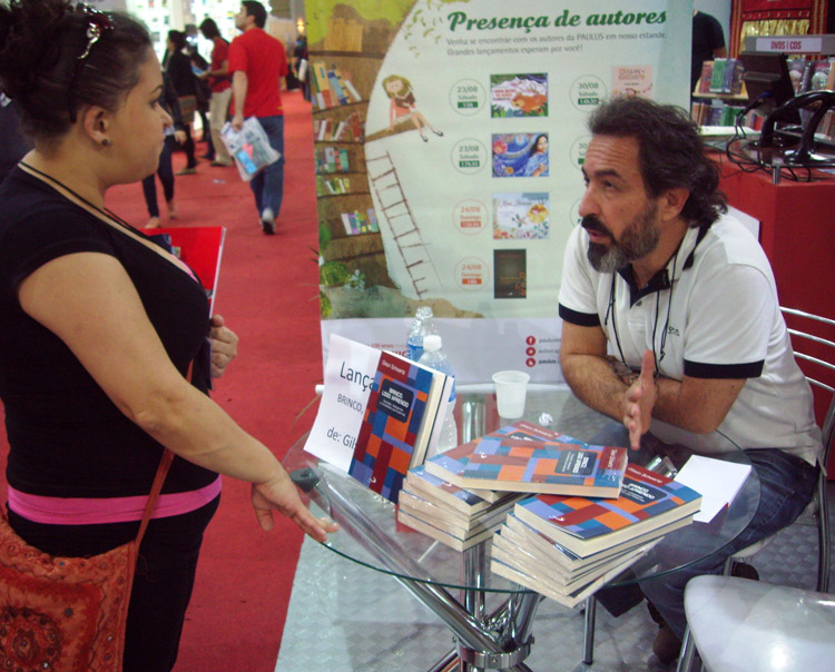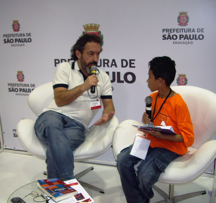 Professor Gilson Schwartz é entrevistado por aluno repórter, do projeto Imprensa Jovem, da prefeitura de São Paulo. Os alunos, de diversas escolas municipais, realizaram entrevistas de rádio com autores e personalidades presentes no evento
