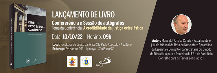 Na oportunidade, haverá também o lançamento da obra “Direito Processual Canônico”, escrita por Pe. Manuel Jesús Arroba Conde, com sessão de autógrafos. Fruto de mais de trinta anos de magistério, a publicação está em sua sétima edição na Itália e chega ao Brasil para suprir uma carência de bons manuais na área, conforme assinalam os tradutores, Prof. Dr. Pe. Tarcísio Pedro Vieira e Prof. Dr. Pe. Valdinei de Jesus Ribeiro, CMF. Na terça-feira (11), às 9h, haverá um evento de lançamento no Rio de Janeiro (RJ), no auditório do Pontifício Instituto Superior de Direito Canônico, em Rio Comprido, na capital fluminense.