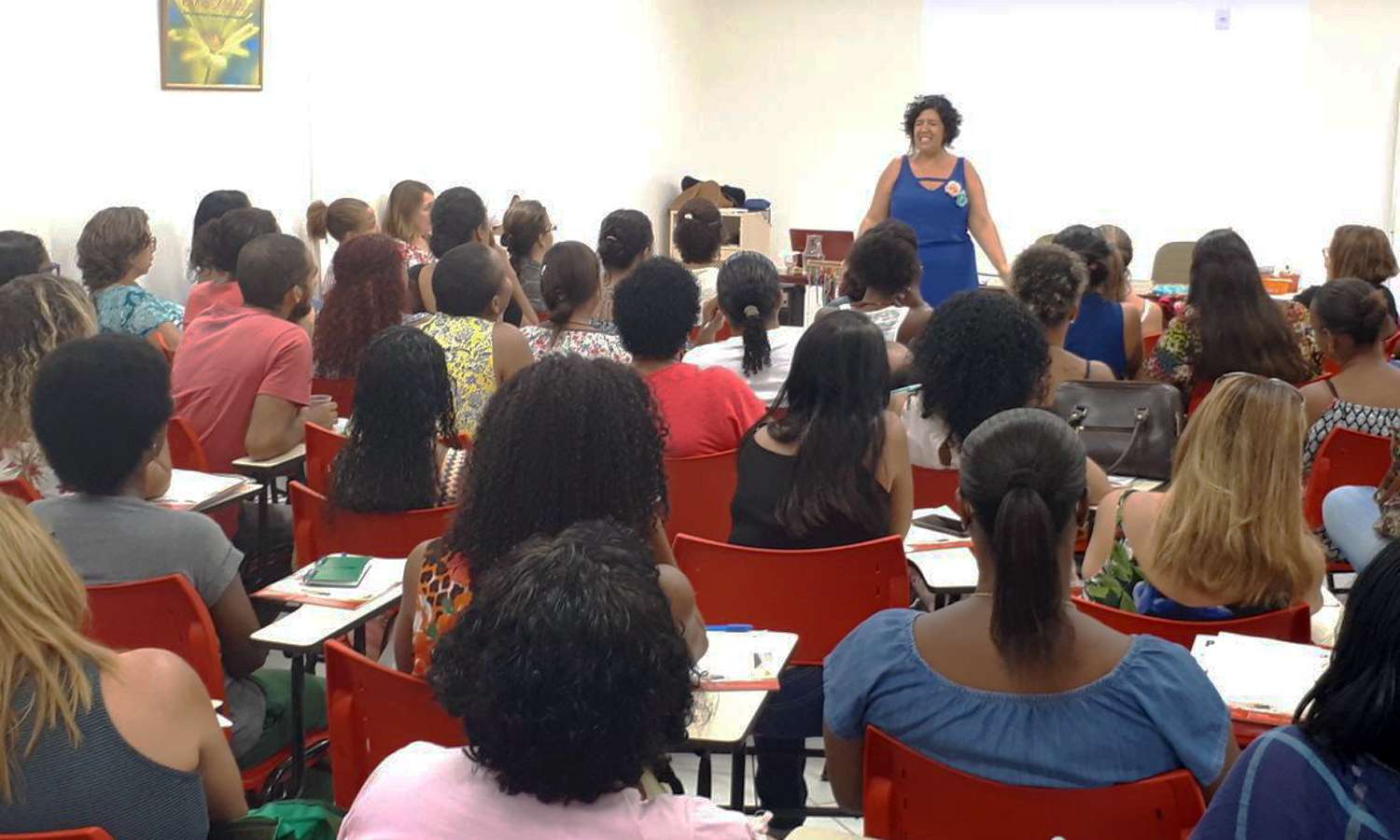 Com o tema “Contar histórias – Reinventar o mundo: da contação às práticas de leitura”, a escritora Danielle Ferreira Andrade conduziu a atividade, que foi composta por uma variedade de cantigas, histórias e exibição de adereços que podem ser utilizados.