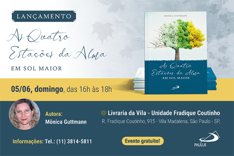 No próximo dia 05 de junho, das 16h às 18h, a PAULUS Editora promoverá o lançamento da obra “As Quatro Estações da Alma em sol maior” novo título da coleção “Vida Nova” e escrito por Mônica Guttmann. O evento presencial organizado pela PAULUS ocorrerá na Livraria da Vila – Unidade Fradique Coutinho, localizada na Rua Fradique Coutinho, 915 – na Vila Madalena, em São Paulo – SP.