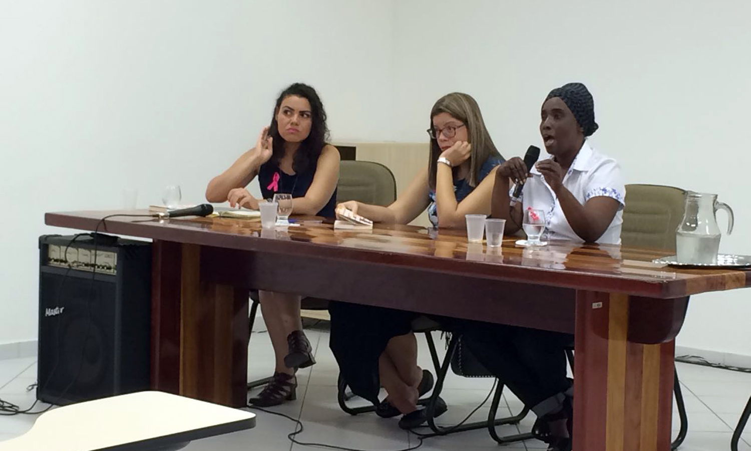 Em seguida, teve início um debate com o tema “Feminícidio: por que o Brasil tem posição de destaque?”. Para compor a mesa, foram convidadas a defensora pública estadual de Direitos Humanos Fabiana Almeida Miranda, a fundadora do movimento de População da Bahia Maria Lúcia Santos e a jornalista Karla Maria.