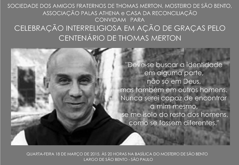 Realizado no Mosteiro de São Bento, em São Paulo (SP) a programação se inicia às 20h e inclui celebração inter-religiosa. Participarão do evento representantes do Judaísmo, da Igreja Católica, do Islamismo, da Igreja Presbiteriana Unida, Religião de Matriz Africana, Budismo Zen e Espírita Kardecista. Outro destaque da programação é a apresentação da cantora Fortuna junto com o coral dos monges do Mosteiro de São Bento, o evento terá também a Inauguração da Exposição de Fotos e Desenhos de Thomas Merton, Palestra com Dom Bernardo Bonowitz, lançamento do Livro Mertonianun 100, coquetel, entre outros.
