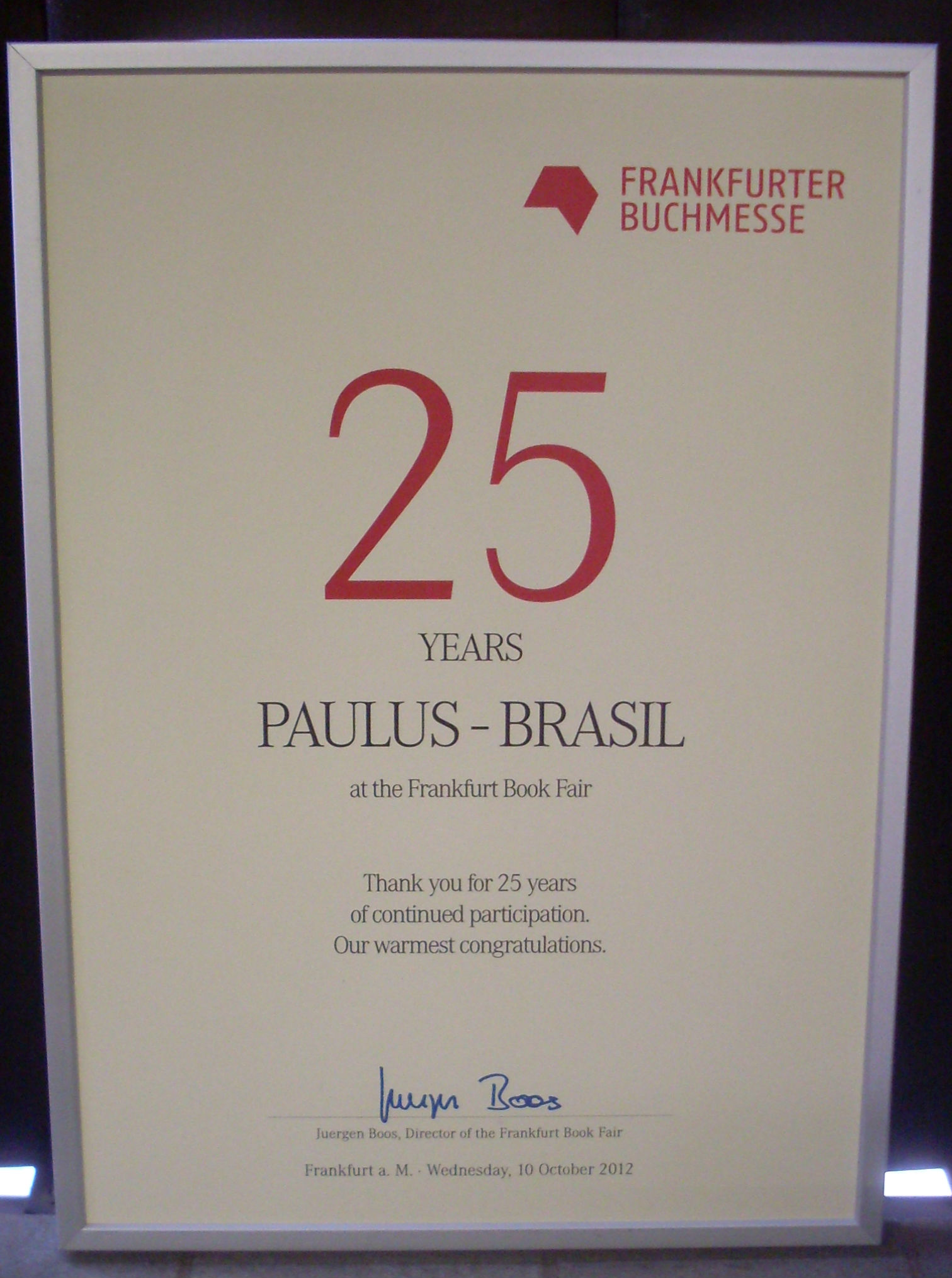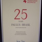 Parceira do evento, a editora recebeu de Juergen Boos, diretor da feira, uma placa comemorativa pelos 25 anos contínuos de participação. “É muito gratificante recebermos esse reconhecimento, estamos muito felizes”, afirmou Zolferino Tonon, diretor multimedial da PAULUS no Brasil.